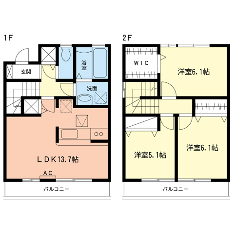 LDK 13.7帖/洋室 6.1帖/洋室 6.1帖/洋室 5.1帖